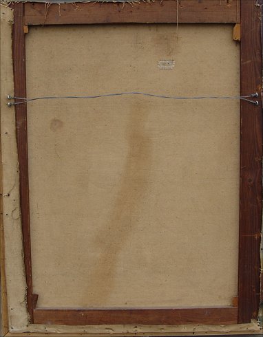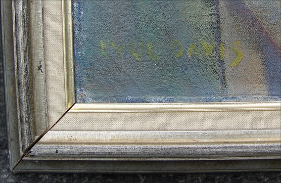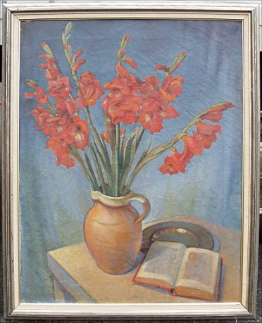 DAVIS, Cyril, (English, -1935): Modernist still life of red gladiolas, O/C, 36'' x 28'', signed lower left, encased in silver gilt frame. Condition - Patch visible verso in upper margin, craquelier throughout.