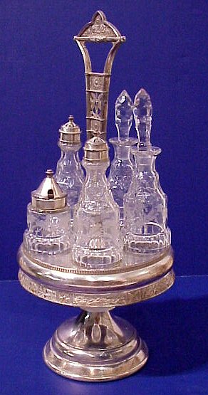 REED & BARTON VICTORIAN SILVERPLATED CONDIMENT STAND WITH BOTTLES: Matched set of 5 etched bottles. Mustard, 2 shakers, vinegar, and oil.