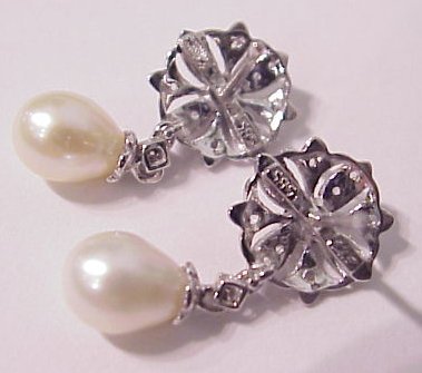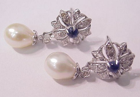 GLAMOROUS PEARL, SAPPHIRE & DIAMOND EARRINGS: 14k white gold floral motif mount scattered with diamonds, centered with a cabochon sapphire and supporting, on a diamond dangle, a 6mm x 8.5mm white pearl, pierced earrings marked 585 and illegible designer's mark, approx. 7/8''l. A complementary pendant sold at lot 31.