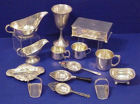 ESTATE ACCUMULATION OF STERLING AND SILVERPLATE: To include Balwin Miller goblet, pair of Lunt cigarette baskets, Alvin embossed pin tray, 3 sterling baby cups, silverplated nut dish, a nice plated footed box, Wm Adam gravy boat, a sterling sauce boat, and 3 silverplated tea strainers, one from the Queen Elizabeth.