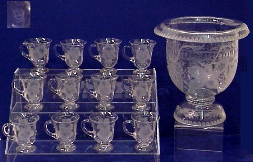 BEAUTIFUL LIBBEY ENGRAVED GLASS PUNCH BOWL, WITH TWELVE CUPS: Elegant pedestal bowl etched in a grape vine motif. The cups have the same elegant pedestals and handles. Bowl is 10 1/2''h, 10'' dia. with rolled edges. The cups are 3''h. Please note minute chip under base of punch bowl.