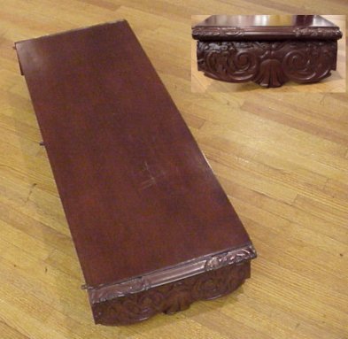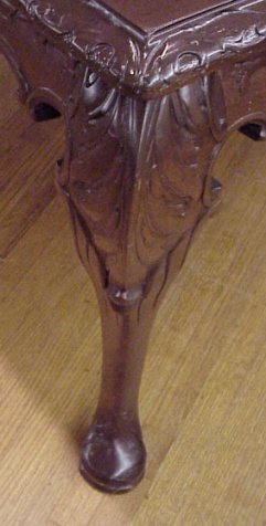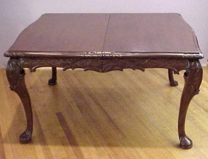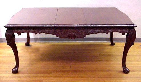 19TH C CARVED MAHOGANY DINING TABLE WITH LEAF: Ornately carved apron, exaggerated carved legs and paw feet. 56''l plus a 17'' leaf, 47''w. Recently refinished.