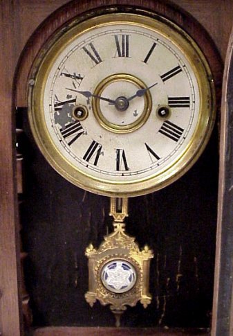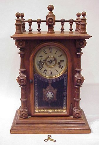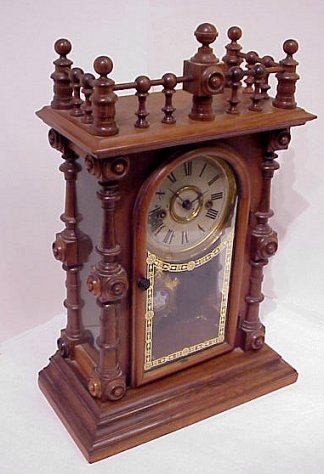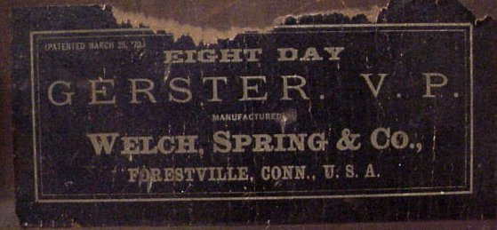 GERSTER WELCH, SPRING & CO. SHELF CLOCK: Walnut case with gallery rail and many turnings. Appears to be the original dial though there is a bit of paint loss to it, Roman numerals, both hands intact. Bell strike movement, Sandwich glass pendulum. Paper label on the back states this is an ''Eight Day Gerster. V.P. Welch, Spring & Co. Forestville, Conn., U.S.A. 18 1/2'' x 10 1/2'' x 6 1/2''.