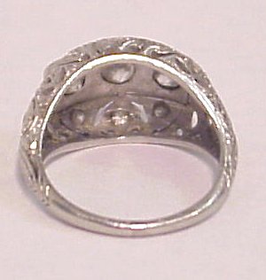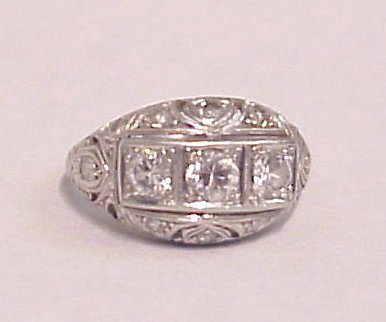 PERIOD PUFFED PLATINUM DIAMOND RING: Filigree ring circa 1920 centered by three diamonds of approx. 30pts each, surrounded by filigree work set with more small diamonds, approx. 1ctw, size 4 3/4.