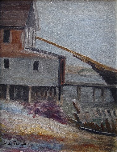 POWELL, Mary E., (American, 20th C): Dock side scene, O/B, 7 1/4'' x 5 3/4'', signed lower left.