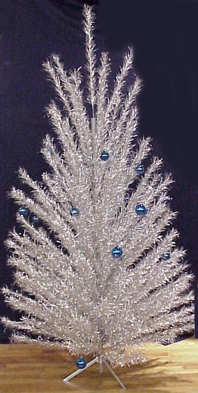 1950'S ALUMINUM SILVER CHRISTMAS TREE WITH COLOR WHEEL: 8 ft. tall with blue glass ornaments. In the original box. Made by United States Silver Tree Co.