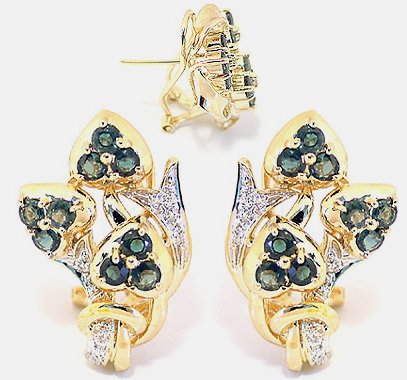 2CT MONTANA SAPPHIRE & DIAMOND EARRINGS: These stunning 2ct RARE Teal Montana sapphire earrings features brightly cut rounds (9 each) set in 14k yellow gold, clustered in three flower spray mounting and accented with diamonds. Notice that this pair is quite substantial and sizeable measuring 15/16'' long by 5/8'' wide and weighing 8 grams. Expertly crafted and finished with sturdy french clip omega style pierced backings. Retail Value $1105.00