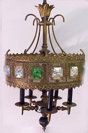 METAL CHANDELIER SET WITH TIFFANY TYPE GLASS MEDALLIONS: 5 candle type lights surrounded by a reticulated brass shade set with medallions. Approx. 25''h.
