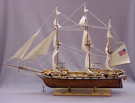 USS CONSTELLATION: Intricate model built NOT from a kit by local craftsman. The Constellation was named by President Washington in honor of the constellation of 15 stars in our flag at that time. Was built to serve against the pirates of the Barbary States, then in use in the Civil War. The model is constructed of wood, copper, cloth, and string. Approx. 39'' x 29''.