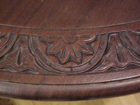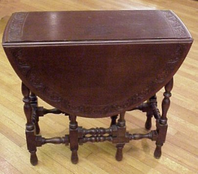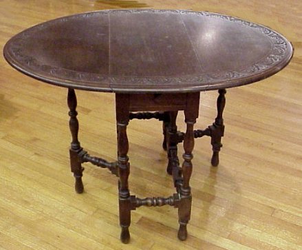 CARVED MAHOGANY GATE LEG TABLE: One drawer, oval top, drop leaf table with relief carved border. 31''w.