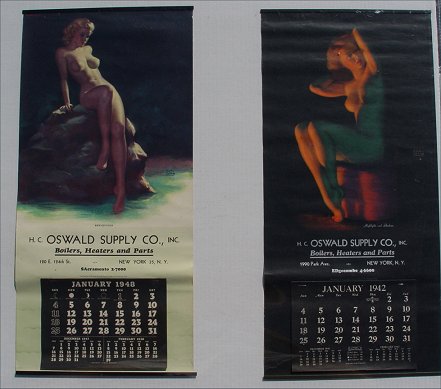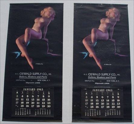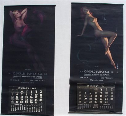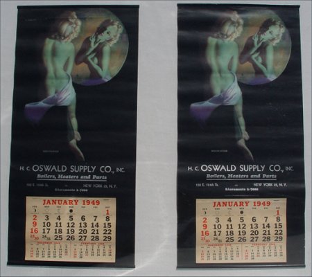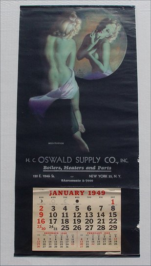 8 pc COLLECTION OF ORIGINAL EARL MORAN PIN UP CALENDARS: 1941 ''The Dancer'', 1942 ''Highlights and Shadows'', two 1943 ''A Modern Eve'', 1948 ''Reflection'', three 1949 ''Meditation''. Sold with an additional 1947 pin up by Zoe Mozert titled ''Moon Glow''. All posters 22 1/2'' x 11'', all done for the HC Oswald Supply Co. New York NY. Condition - All have minor wear around edges, the Mozert has a few creases in the image and one of the ''Meditation'' which has tears in the middle and lower right margins.