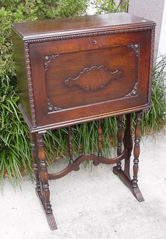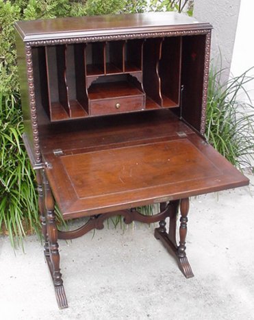 1930's DESK ON STAND: Fall front desk with interior cubicles rests on base of turned legs and supports. Approx. 46''h. x 27 1/2'' x 13 1/2''.