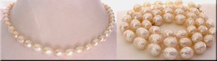 FACETED WHITE PEARL NECKLACE: This gorgeous 30'' strand features genuine 9x11mm white faceted pearls. These drop/oblong shaped pearls are individually hand faceted, have a thick nacre and great lustre. The strand is finished with a 14kt yellow gold filligree clasp. Retail Value $739.00