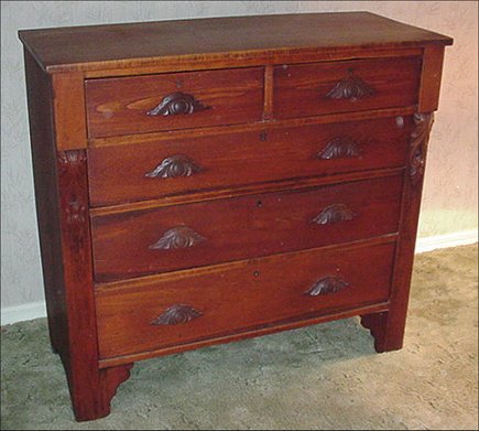 19th C VICTORIAN COTTAGE CHEST OF DRAWERS: Mixed woods, paneled backs, carved pulls, 2 over 3 drawers, applied carving to stiles, 42 1/2''h., 45''w., 19'' deep.