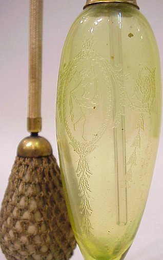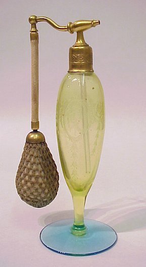 TIFFIN CANARY ''CLASSIC'' ATOMIZER PERFUME: Very rare piece of Tiffin Canary Vaseline glass perfume. Vaseline bottle shades to a blue base. Atomizer in good working condition. Glass tube is intact. 7 3/4''h.