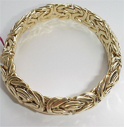 14K GOLD BYZANTINE LINK BRACELET: Pounded texture multilink yellow gold bracelet with pressure clasp and double safety, 8''l., 33gr.