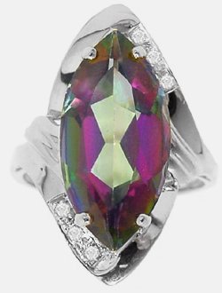 9CT MARQUISE MYSTIC TOPAZ RING: This is a huge mystic topaz ring featuring a large marquise shape accented by diamonds on a bypassing band of 14k white gold. Retail Value $899.00