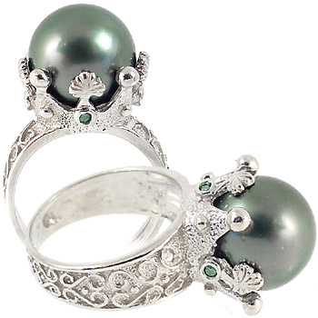 TAHITIAN PEARL CROWN RING: A large 12mm Tahitian pearl is nestled down inside of a crown shaped ring of 14k white gold and accented by four blue green diamonds. Retail Value $1763.00