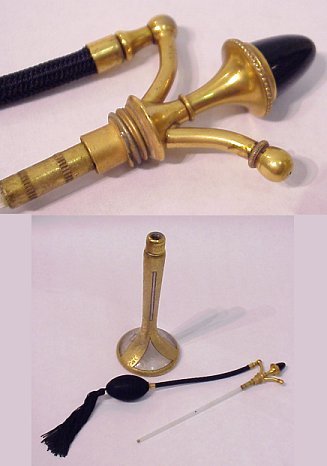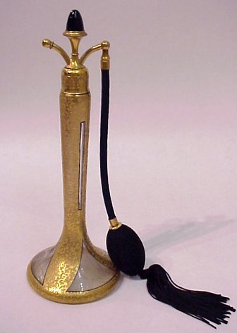 ART DECO GLASS ATOMIZER PERFUME: A most elegant etched glass perfume with textured gold plating outlined in black. Black cabochon finial, cord, and tassel. Glass tube intact. 9 3/4''h., the base is 3 1/2'' dia.