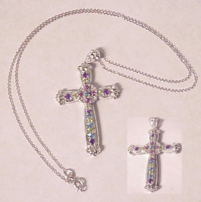 14K WHITE GOLD & SEMI PRECIOUS STONE CROSS: Set with softly colored stones, cross measures approx. 1 3/4''l., on a 14k white gold chain 16''l.