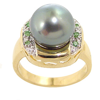 TAHITIAN PEARL SOLITAIRE RING: This elegant ring features a large round Tahitian pearl, 10mm, accented on both sides by three green diamonds. Set in 14k yellow gold. Retail Value $1565.00