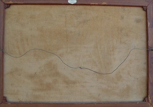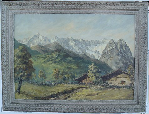 EUROPEAN ALPINE LANDSCAPE WITH COTTAGES, CA 1940'S: O/C, 24'' x 33 3/4'', signed lower left Heck?, illegible German writing verso, signed on canvas verso, encased in a Reichenstein frame of the period. Condition - Craquelier throughout, small indentation to canvas in sky.