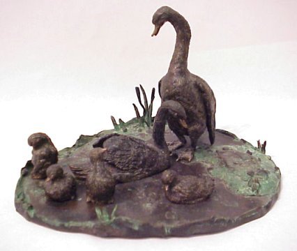 ADORABLE BRONZE POND: Patinated bronze pond with naturalistic plants to edges, occupied by a family of swans, 2 adults and 4 chicks, all mobile for your placement. Pond approx. 8'' x 10'', swans ranging from 2'' babies to 5 3/4'' adults.