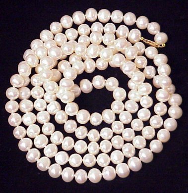 NEVER-ENDING STRAND OF PEARLS: 50'' strand of white cultured pearls, 8-8.5mm each, double knotted for secure enjoyment, 14k yellow gold fish hook clasp.