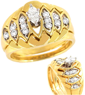 DIAMOND ENGAGEMENT/WEDDING SET: This two piece set features .38cttw of white diamonds. The engagement band has a marquise cut center stone, and is flanked on both sides by three rows of diamonds graduating in size. The wedding band fits snugly to the engagement band for a great look. 14k yellow gold. Retail Value $2365.00
