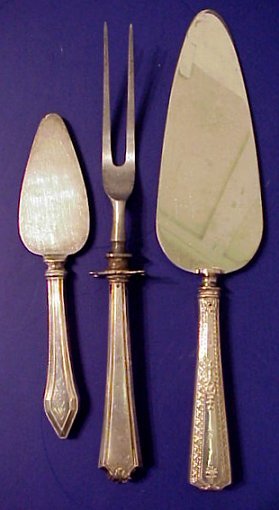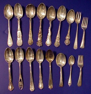 LOT OF STERLING SOUVENIR & ETCHED TEASPOONS: To include, 1915 Panama Pacific Exposition, Ashfield Mass, Prince Albert of Belgium, Longfellow, Indiana, Cleveland OH, Alvin in an embossed rose pattern, Lunt, Gorham etc. Sold with Gorham baby set, Gorham cheese? server, and two larger sterling handled serving pieces. Sold as a lot.