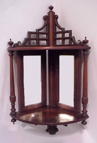 FINE VICTORIAN CORNER ETAGERE: Pierce carved wall mount etagere with beveled mirror back. 26''h.
