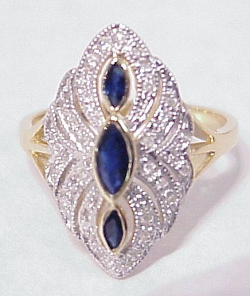 ANTIQUE STYLE FILIGREE SAPPHIRE RING: Center line of marquise cut sapphires of dark blue, bezel set in yellow gold above a diamond encrusted field of white gold, on a yellow gold band, 14k, size 7.