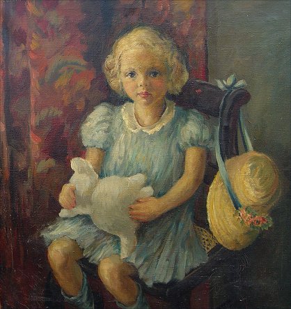 MOULD, Ruth, (American, 20th C): Portrait of a seated child with stuffed bear, O/C, 30'' x 28 1/2'', signed upper left. Condition - Some craquelier lower right.