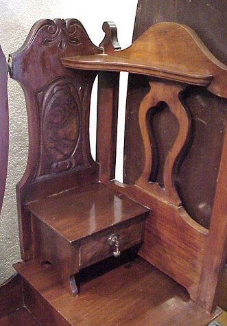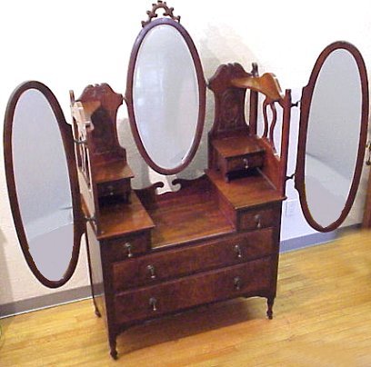 VICTORIAN GULL WING DRESSER: Oval mirrors in triple. Drop center dresser with burled and relief carved panels. Heavy drop pulls, glove drawers and candle shelves. Center mirror is 34''h., side mirrors are 42''h. Chest is 73''h. overall, 40''w.