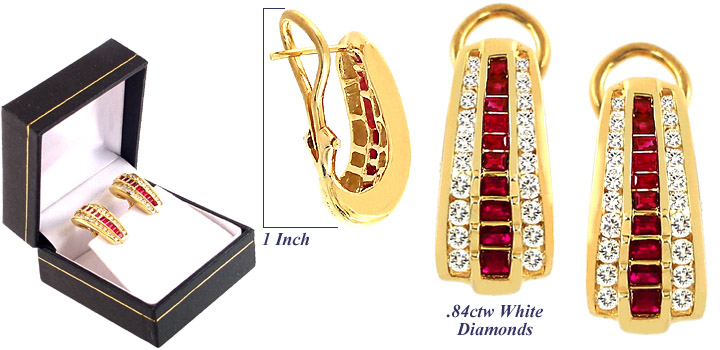 RUBY & DIAMOND EARRINGS: These fantastic earrings are set in 18k yellow gold and feature a center row of princess cut channel set rubies which is flanked on both sides by rows of round cut channel set white diamonds, Omega backs for comfort. Retail Value $3950.00