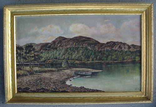 MAIN, Alex, (Scottish, 19/20th C): ''Silver Strand, Lock Lomond Scotland'', O/C, 14'' x 23'', signed lower right, label affixed verso. Condition - Small patch visible verso in lower margin, encased in original gilded molding.