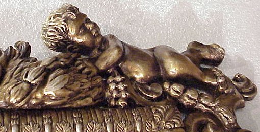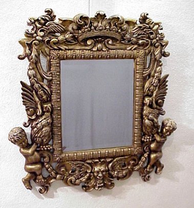 DECORATIVE CHERUBIC MIRROR: Composition resin, gilt finish. This mirror has it all. Cherubs and eagles at the sides, griffon heads at the top corners and a crown at the crest. Wood back. Beveled glass is 23'' x 19'', the frame is 47'' x 39'' overall.