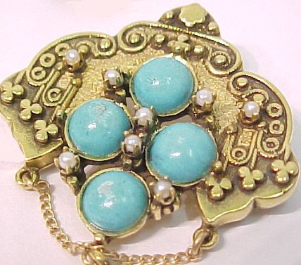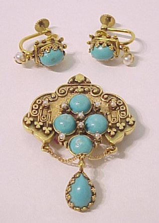 TURQUOISE & PEARL PIN/PENDANT & EARRING SET: Three piece Etruscan style set consisting of heavy 14k yellow gold pin, which can also be a pendant, set with four round cabochon turquoise, eight seed pearls and a turquoise drop. Earrings are also 14k, set with oval cabochon turquoise and seed pearl drops, screw back. Entire set weighs over 17 grams!