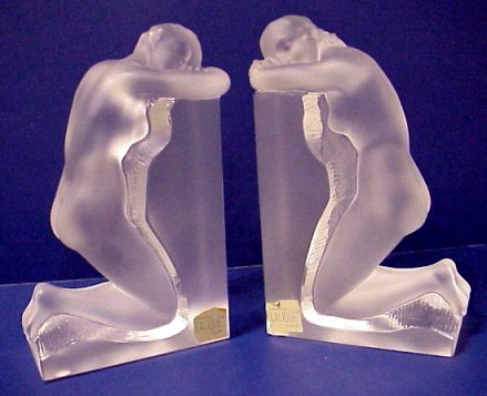 LALIQUE CRYSTAL ''REVERIE'' NUDE FIGURAL BOOKENDS: In as found condition with a chip to the base of each. Engraved Lalique France and with foil label. 8 1/2''h. Originally retail at over $3000.