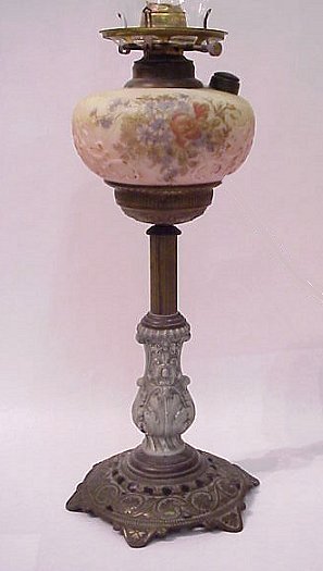 WAVECREST TYPE BANQUET OIL LAMP: Font is a floral decorated Wavecrest type glass that is removable from the embossed metal base. Electrification is through the burner and did not harm the font. 27''h. overall with chimney.
