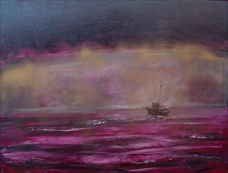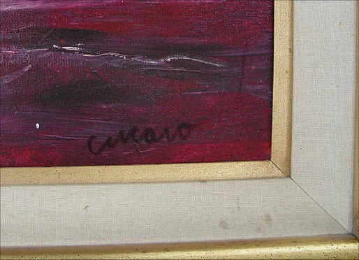 CUCARO, Pablo, (American, 1915-): Purple harbor scene with ship, O/C, 30'' x 40'', signed lower right. Condition - Small pin hole in center of painting.