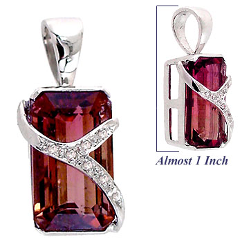 TOURMALINE & DIAMOND PENDANT: This unique pendant features a rectangular cut deep, rich pink tourmaline with a wave of pave set diamonds holding the stone on the bail. Retail Value $1745.00