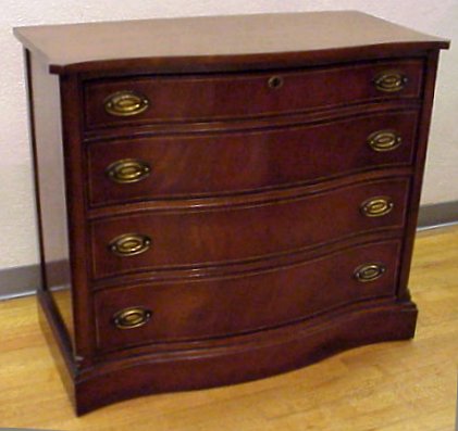 MAHOGANY SERPENTINE FRONT SERVER / CHEST: String inlay 4 drawer chest. Shaped top, divided and lined top drawer. Approx. 33 1/2''h, 38''w, 18 1/2'' deep.