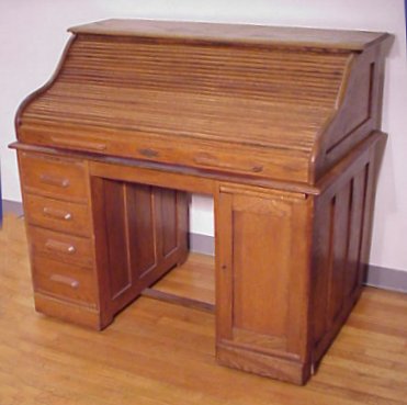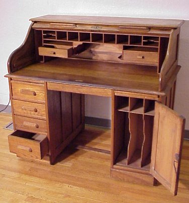 GOLDEN OAK ROLL TOP DESK: ''S'' curve top slides open to reveal interior cubicles and drawers. Four drawers on one side, single door on the other with file slots. 45''h, 50''w, 30'' deep.
