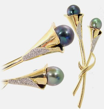TAHITIAN DOUBLE PEARL & DIAMOND FLOWER PIN: This attractive pin features two gorgeous Tahitian pearls, 10/11mm, set in a large flowering lily style with diamond accents. The pin is solid 14k yellow gold. Retail Value $2197.00