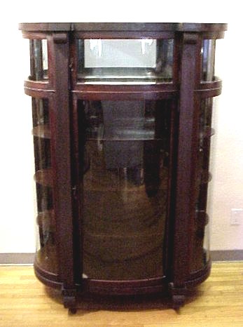 MAHOGANY BOW SIDE CHINA CABINET: Turn of the century Empire mahogany cabinet with bowed sides and front. Upper section has a mirrored back and separate door from lower section. Lower section has shaped shelves with plate grooves. Scrolled feet. Approx. 65 3/4''h., 44''w, 1'7''deep.