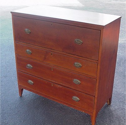 EARLY HEPPLEWHITE 4 DRAWER CHERRY CHEST: Deep, 11 1/2", top drawer over three drawers. brass framed escutcheons, oval drawer pulls embossed with American eagle. 45"h. x 44 1/2"w. x 20"d. | 600 |