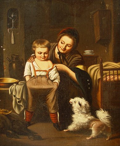 19TH C SCOTTISH ILLUSTRATION INTERIOR SCENE: With mother, child and dog, O/C laid on board, 19 1/4" x 16", no visible signature. Condition - Some separation of canvas, some repaired tears, craquelier throughout, several repaired tears in margins, in need of cleaning. | 275 |
