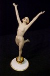 HUTSCHENREUTER ART DECO NUDE FIGURE: Fine modeling designed by Karl Tutter. Woman stretching to the sun, standing on a gilt ball. 8 1/2"h. | 190 |