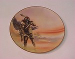 BLOWN OUT NIPPON PLAQUE SHOWING IMAGE OF NATIVE AMERICAN: Hand painted scenic sunset, blown out full bodied Native American, 10 1/2"dia. Pierced back for wall hanging. Marked with the Morimura Bros. M in a wreath. | 600 |